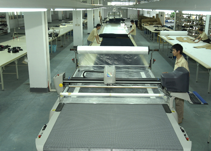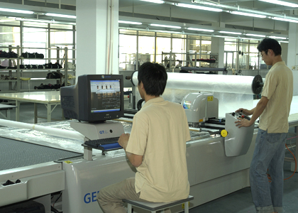 公司采用CAD計算機輔助排料系統(tǒng)進行排料,該系統(tǒng)準確、高效。鋪料機代替手工鋪料的優(yōu)點使鋪料均勻、整齊、松緊適宜、降低工人勞動強度。