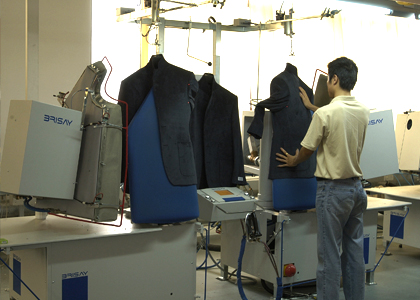 運用高品質的德國BRISAY立模整燙機,采用電腦控制蒸汽輸出量、溫度、壓力、定型、抽濕時間,根據(jù)面料的厚薄、質地、性能,以38種不同整燙程序調整以上各個參數(shù),配合服裝的整燙。